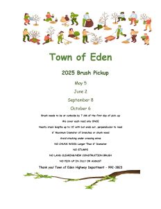The Town of Eden holds an annual tire & scrap metal drop off event at the Eden Highway Garage. Stay tuned for the May 2026 date.