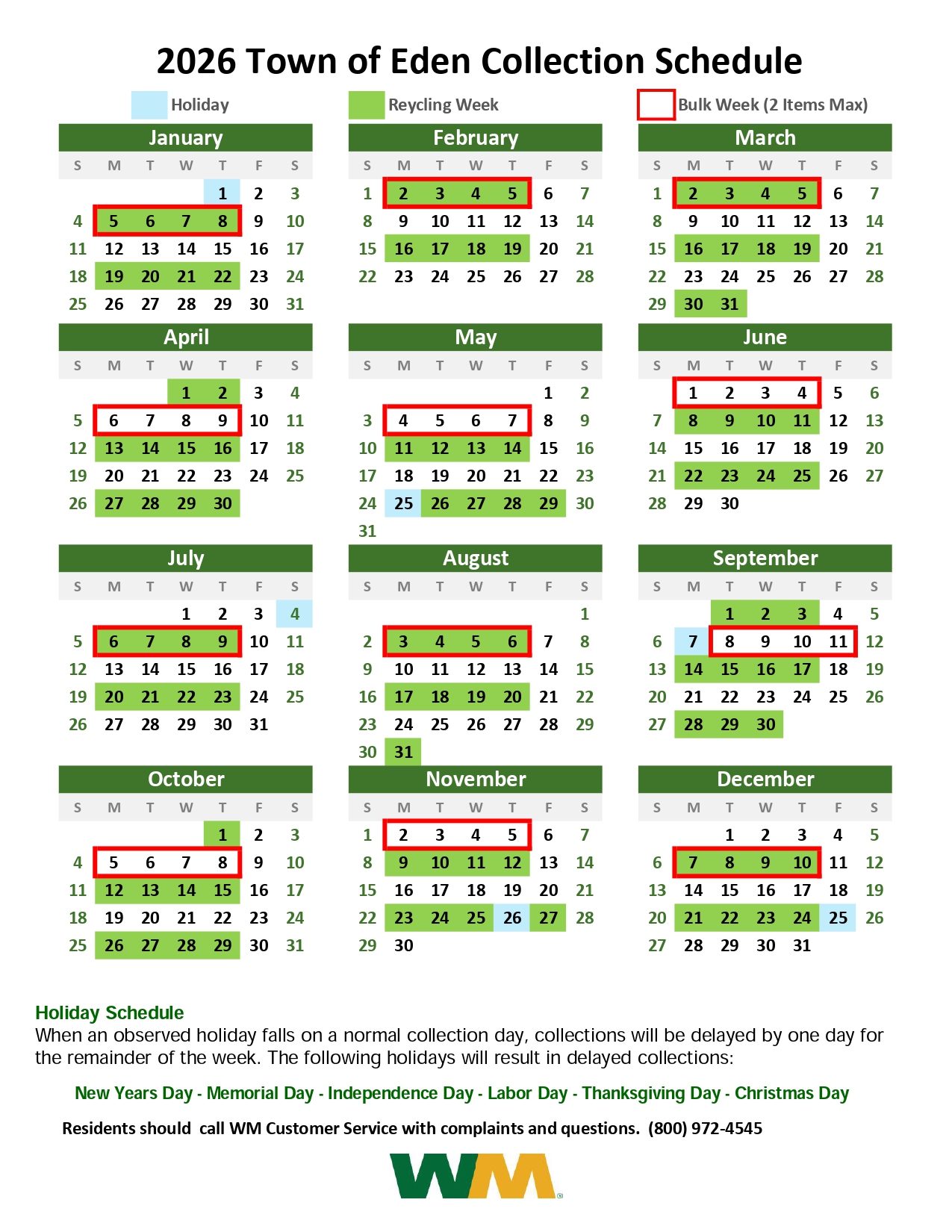 The Town of Eden has contracted with Waste Management for Refuse and Recycling of Solid Waste, Bulk items and White Goods.